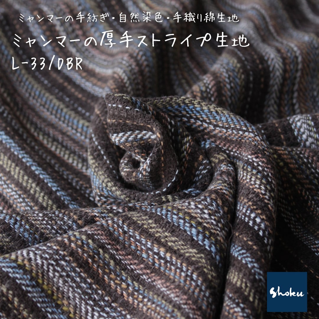 【厚手茶系ストライプ綿生地】天然綿100% L-33/DBR(511) ミャンマーの手紡ぎ・自然染色・手織り 約74㎝巾(10cm単位で販売いたします。) Shokuの布