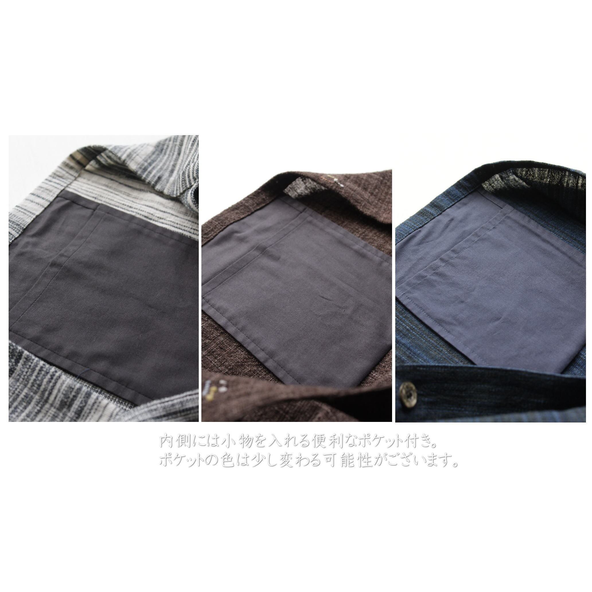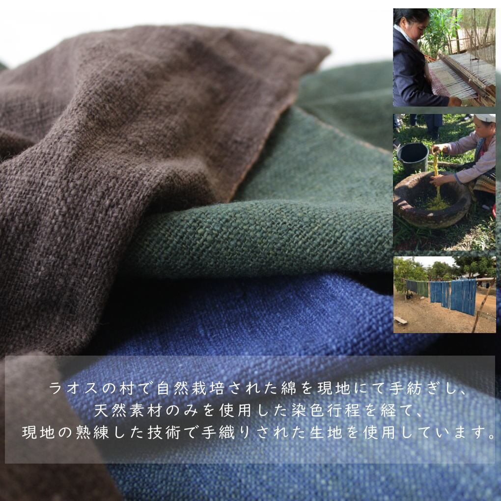 商品説明:ラオスの村で自然栽培された綿を現地にて手紡ぎし、天然素材のみを使用した染色行程を経て、現地の熟練した技術で手織りされた生地を使用しています。縫製は大阪府池田市のShokuの店にて長年縫製に携わるスタッフが丁寧に行っています。