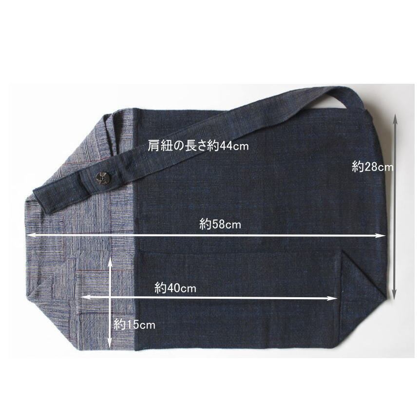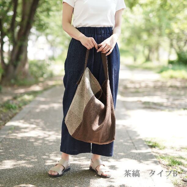 手紡ぎの糸は細いところや撚りが甘く太いところが入り混じり、独特の表情があります。自然染色の色もまた自然に力を借りなければ出ない奥深い色合いをしています。少な目荷物でくったり使ってもかわいいデザインですが、急なお買い物などで突然お荷物が増えても対応できる器の大きなバッグです。天然綿100%の丈夫な生地ですので、丸洗いできます。デニムや革のように使うほど味が出る自慢の生地を使用しています。