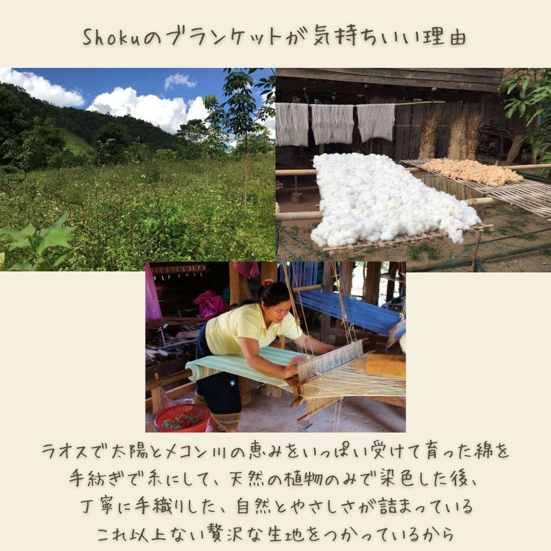 ラオスの村で自然栽培された綿を現地にて手紡ぎし、現地の熟練した技術で手織りされた生地を使用しています。甘い紡ぎの糸を甘く織った優しい肌触りの生地。端は全面ブランケットステッチで丁寧に仕上げています。繊維の中心が空洞になっている綿は保湿性・保温性に優れており、一年中使いたくなるブランケットです。150cm×200cmのこのブランケットは大人用のブランケットに良いサイズです。使うほどにやわらかく育つブランケットです。