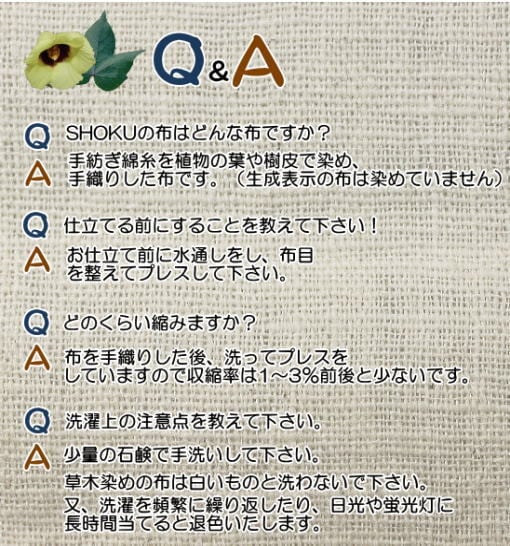 この製品の素材は綿を手で紡いで糸にし、草木で染め、手織りしてできた綿布を使用しています。そのため、糸のかたまり、色むら、筋などがあり、均一でない自然な表情が生まれます。
