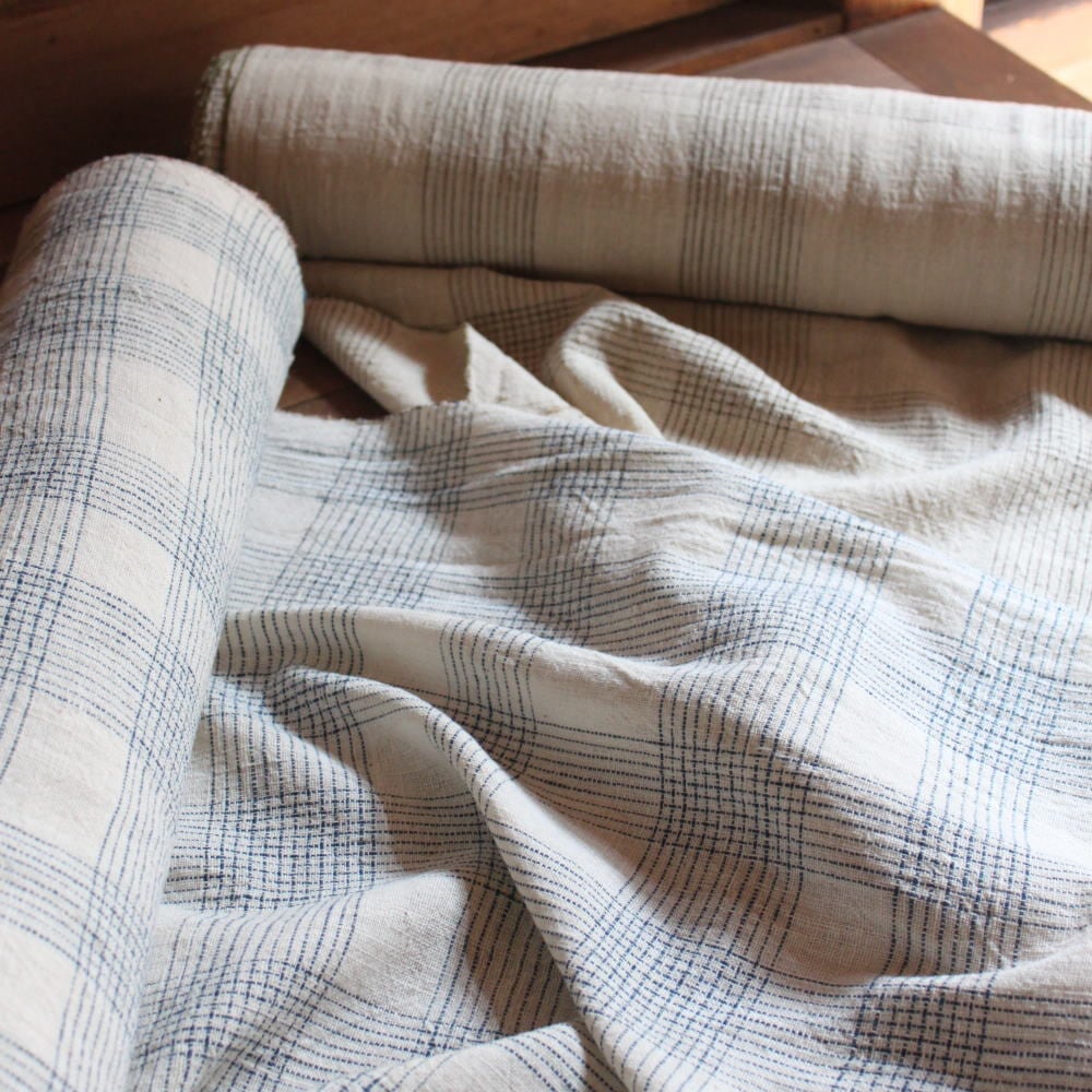 集まったラインが不規則な間隔でクロスする印象的な格子模様の生地。他の村の生地と比べ硬めの紡ぎでさらりとした肌ざわりです。